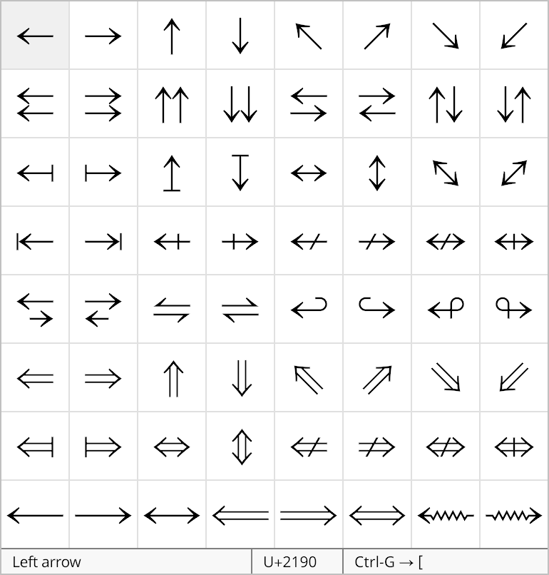 This palette contains a variety of arrow symbols corresponding to Unicode characters. Larger stretchable arrows with optional labels are found in the Big Arrows palette below.