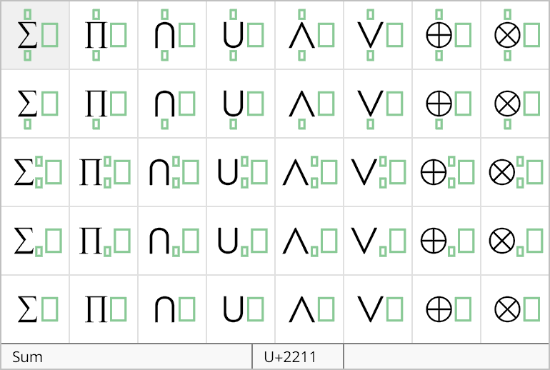 This palette contains all of the Greek letters, including some obscure variants. Small Greek letters are inserted with an italic style, and capital Greek letters are inserted with an upright style. (You can toggle between these two styles by selecting a Greek character and typing Ctrl+G.)