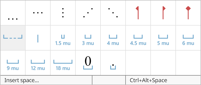 This palette contains a variety of spaces and ellipsis symbols. It also contains the three types of aligners that can be used to align parts of a multi-line expression. Spaces of arbitrary size can be added to an equation by using the Insert Space command.
