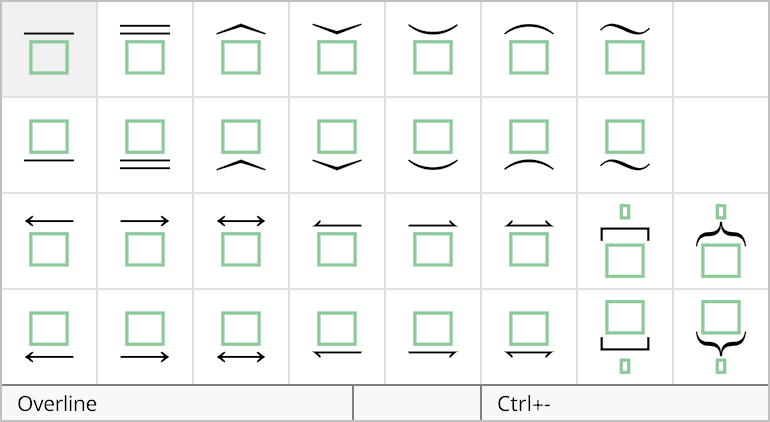 This palette contains stretchable wide marks that can appear above or below arbitrary expressions. Small accents or marks that only appear above or below a single letter should use the Marks palette above.